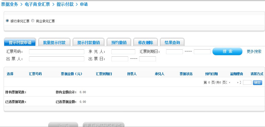 在票据到期日或到期日后10天内进行提示付款:制单员点击“票据业务-电子商业汇票-提示付款-申请”制单,然后按照票据流程进行复核。提示付款成功后,票据状态为“提示付款待签收”。等待承兑银行将资金主动划给您,后,票据状态为“提示付款已签收”,次日票据状态为结清。如果超过到期日后10天但未超过一年提示付款,请在“逾期理由”栏删除系统提示信息并填入真实逾期原因,再提示付款。
