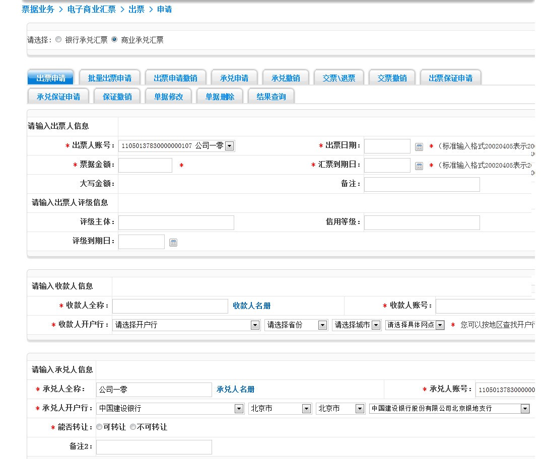 第一步:制单员点击“票据业务-电子商业汇票-出票-出票申请”进行出票,按照票据流程进行复核,出票成功后票据状态为“提示承兑待签收”;