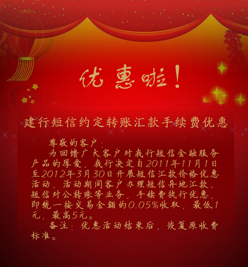 建行短信转账汇款手续费优惠啦!