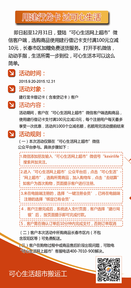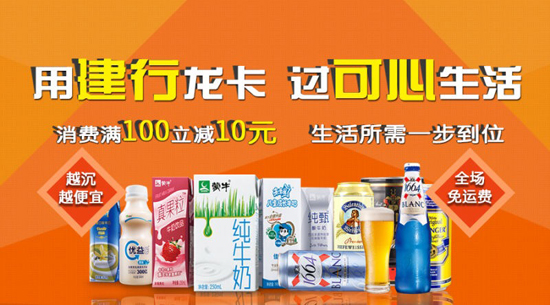 用建行龙卡,过可心生活——借记卡消费100立减10元优惠进行中