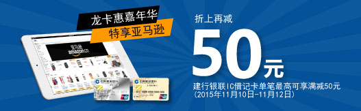 活动二:11月10日至11月12日,建行银联IC借记卡购亚马逊全场自营商品满199减30(可与亚马逊其他优惠叠加)
