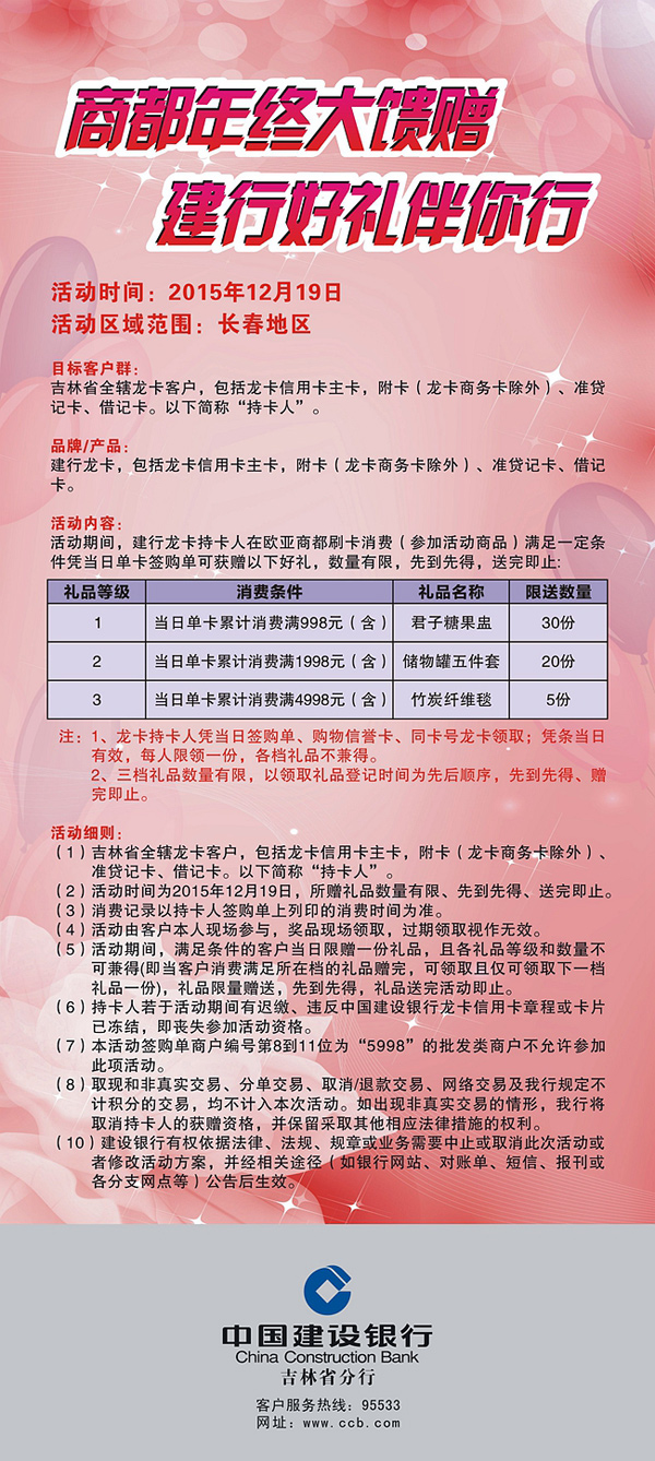 活动期间,建行龙卡持卡人在欧亚商都刷卡消费(参加活动商品)满足一定条件凭当日单卡签购单可获赠以下好礼,数量有限,先到先得,送完即止: