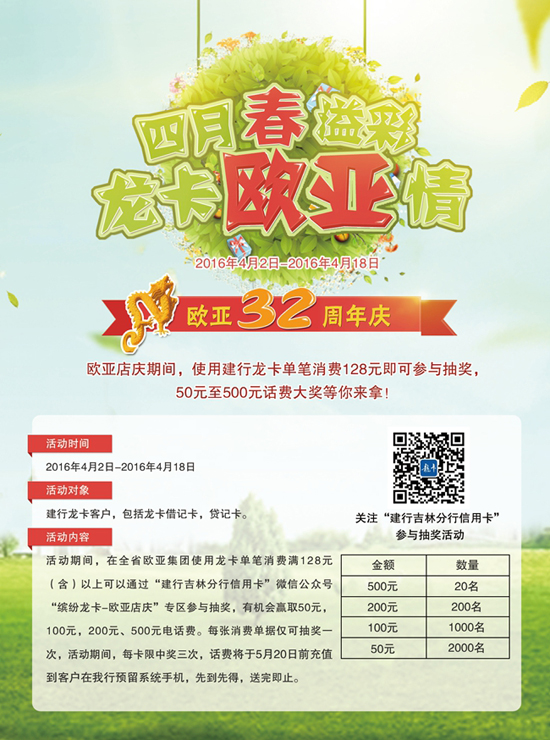 活动内容:活动期间,在全省欧亚集团使用龙卡单笔消费满128元(含)以上可以通过“建行吉林分行信用卡”微信公众号“缤纷龙卡-欧亚店庆”专区参与抽奖,有机会赢取50元,100元,200元、500元电话费。每张消费单据仅可抽奖一次,活动期间,每卡限中奖三次,话费将于5月20日前充值到客户在我行预留系统手机,先到先得,送完即止。