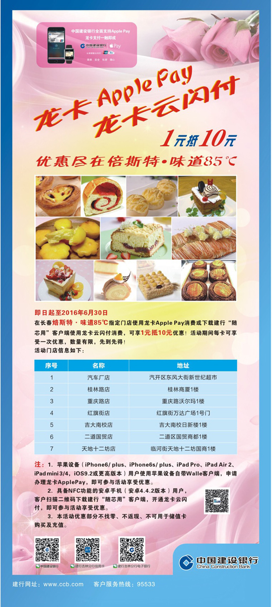 龙卡ApplePay、龙卡云闪付1元抵10元优惠尽在倍斯特•味道85℃