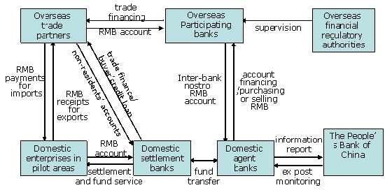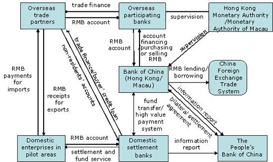 Overseas enterprises can settle transactions in renminbi with Chinese enterprises for cross-border goods trade, service trade and other current account transactions. Enterprises in the pilot areas can settle transactions in renminbi for oversea direct investment.