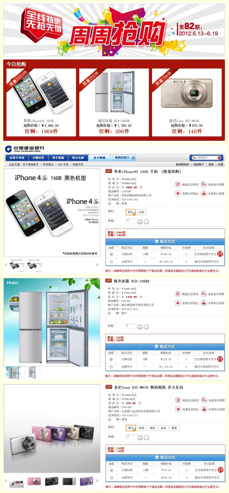 本期(6月13日-6月19日)推出苹果iPhone4S(16GB)手机限量抢购2000台,冰点价4860元/台,分期价405元*12期;海尔冰箱BCD-186KB限量200台,冰点价1359元/台,分期价226.5元*12期;Sony DSC-W630数码相机限量150台,冰点价970元/台,分期价80.83元*12期。猛击http://shop.ccb.com/activity/preference.htm来抢购吧!