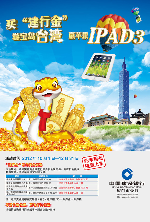 买“建行金”游宝岛台湾,赢苹果IPAD3