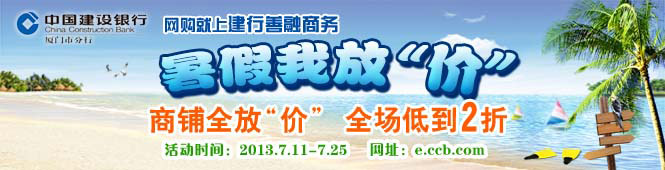 暑假我放“价”7月11日—25日 厦门建行善融商务大放“价”,商铺大幅让利,二折起!详情登录http://www.ccb.com/cn/html1/branch/xm/subject/13/0710sjwfj/index.html