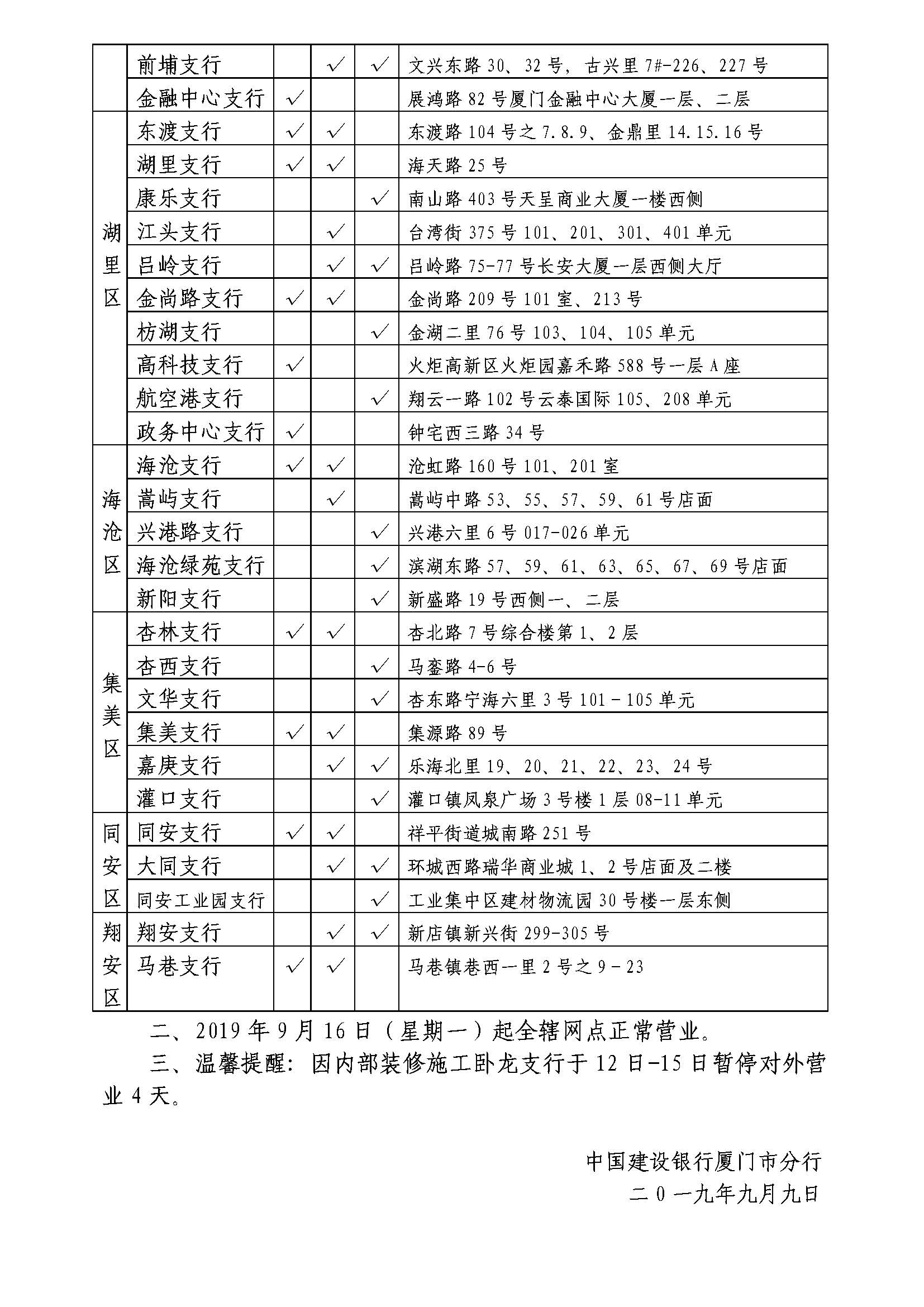 厦门分行2019年“中秋节”期间网点营业时间公告
