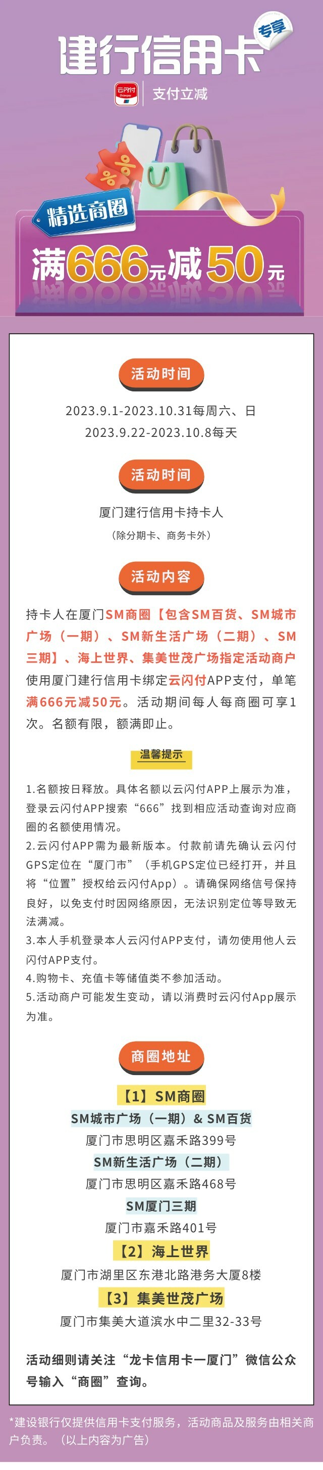 建行信用卡精选商圈满666元减50元